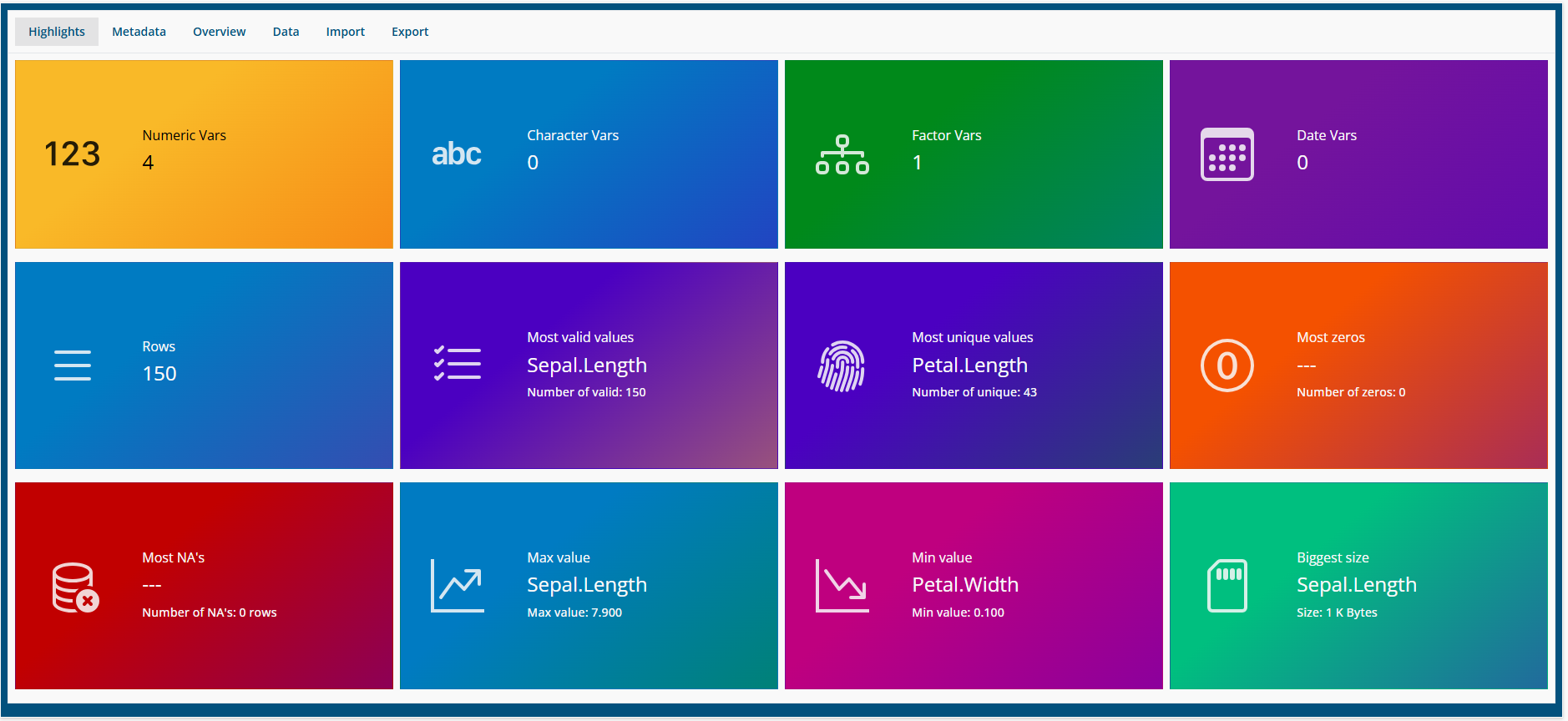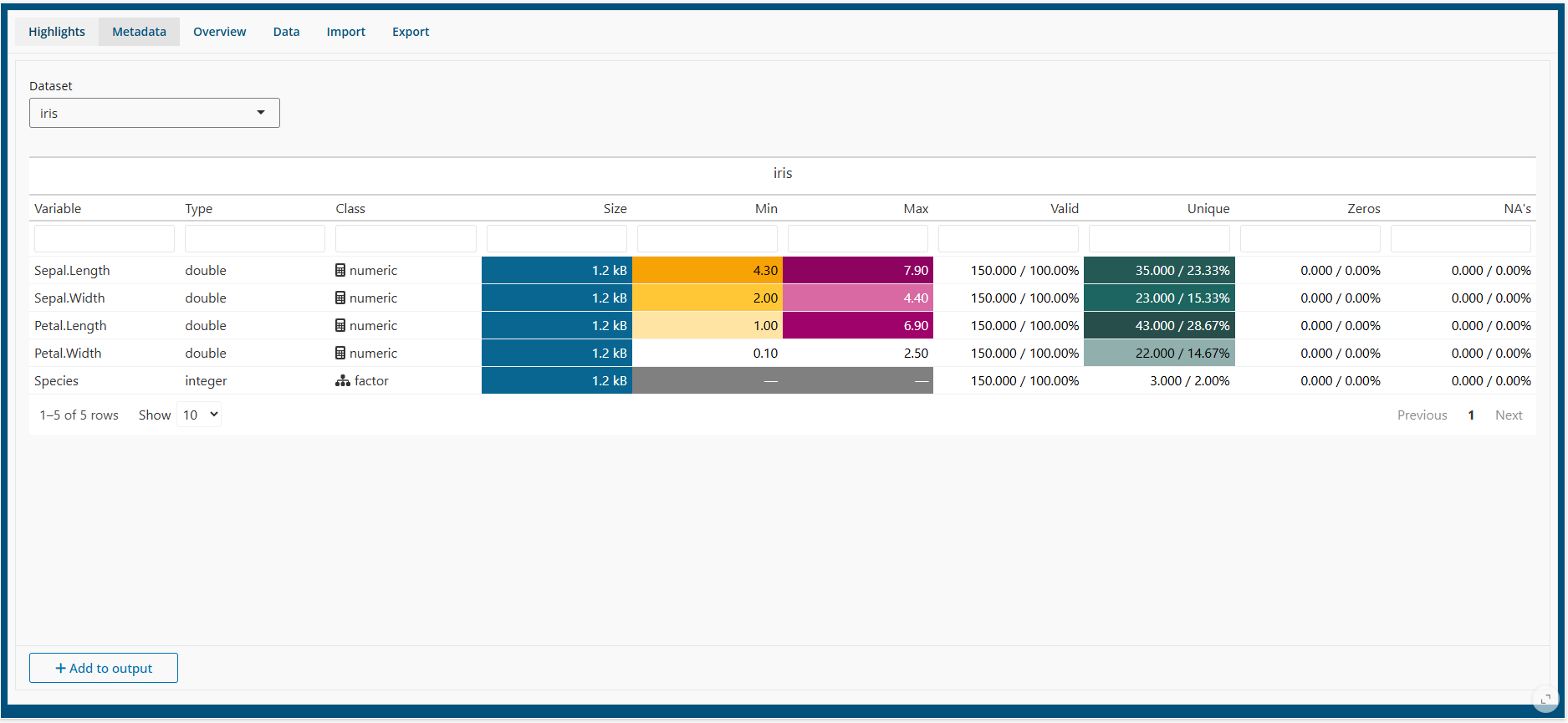 In Metadata one can see tyhe type and class of the variables, as well as some informatios about the data: min and max values, unique, valid, zeros and missing data.