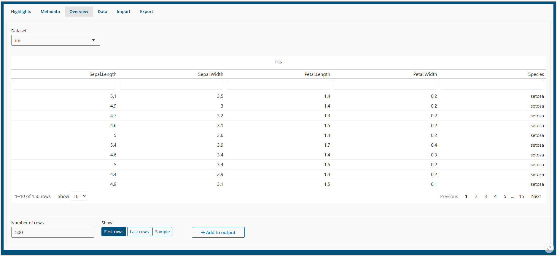 The Overview allows the user to see some sample of Data. It is possible to choose the number of rows to show, as well as the position of the data (if first, last or a random sample of rows).